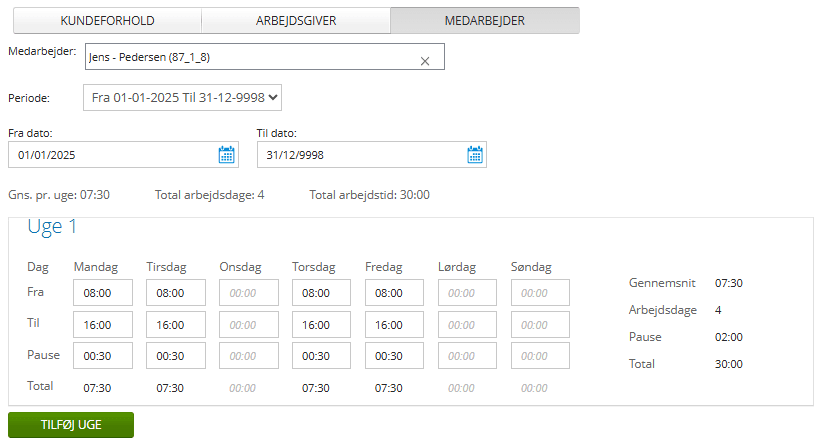 - Klik på ’Tilføj uge’, hvis virksomhedens arbejdsplan ændrer sig fra uge til uge