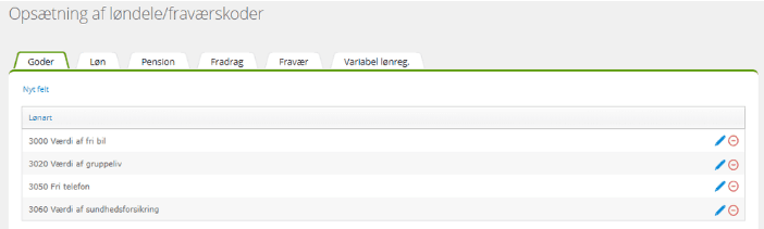 Du kan tilføje nye løndele og fraværskoder ved at klikke på ’Nyt felt’ og vælge fra dropdown-listen. Udover at løndelen eller fraværskoden vises i menupunktet ’Løndele/fraværskoder’, vises den netop tilføjede løndel eller fraværskode også i den respektive opslagstabel.