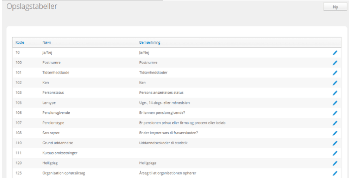 En dropdown-menu svarer til en ’opslagstabel’. Intega HR har en række system-opslagstabeller, der ikke kan slettes. Du kan selv oprette nye opslagstabeller med tilhørende opslagskoder. Opslagstabellerne 0 til 500 er reserveret til systemtabeller, så dem, du opretter, skal have et nummer større end 500.