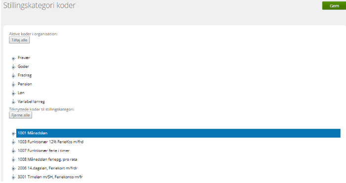 - Find relevant kode i øverste del af skærmbilledet (aktive koder i organisation). Klik på koden, og den er nu tilføjet stillingskategorien. På tilsvarende vis fjernes en kode ved at klikke på den under stillingskategorien.