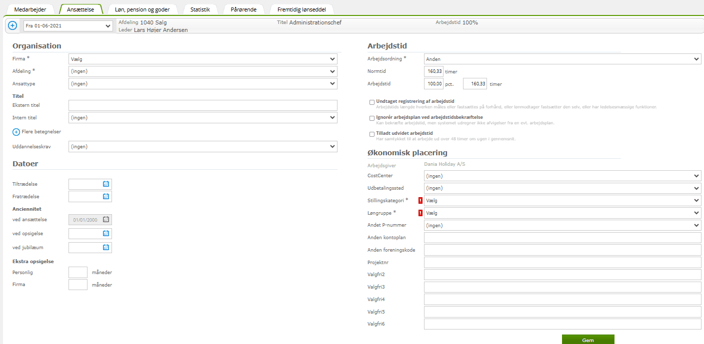 Via dette skærmbillede opretter du medarbejderens ansættelsesoplysninger, eller du kan redigere oplysninger på eksisterende medarbejdere.