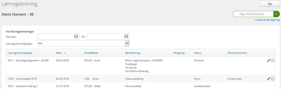 Her finder du oversigt med variable lønregistreringer og mulighed for nye lønregistreringer