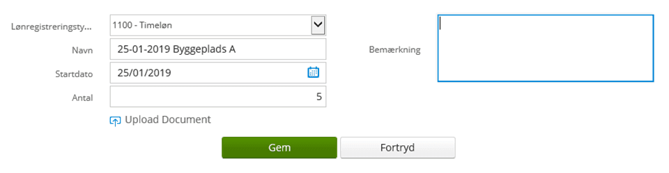 På samme måde kan andre relevante felter blive vist, afhængig af hvilke oplysninger den valgte lønart kræver. Der kan også tilknyttes projektnummer til lønregistreringer, hvis dette er opsat i virksomhedens løsning.