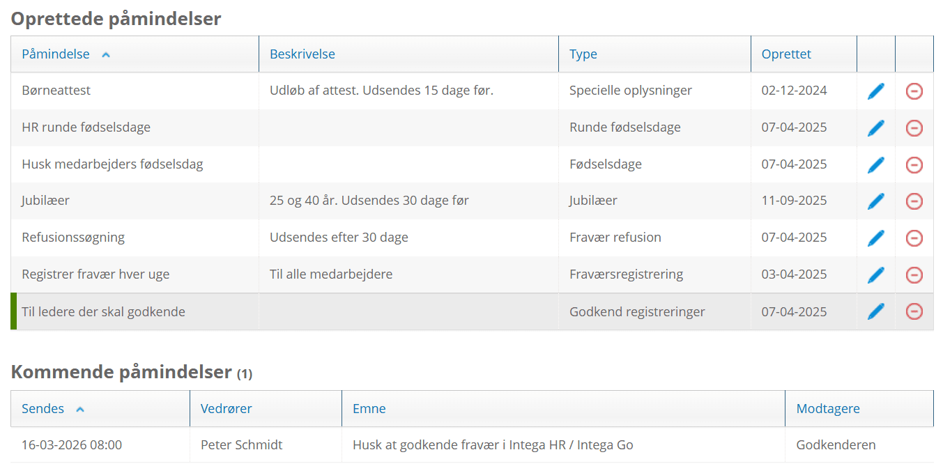 Modulet Påmindelser er for virksomheder, der har Intega HR, og kan tilkøbes af virksomheder med Intega HR Light med Self Service.