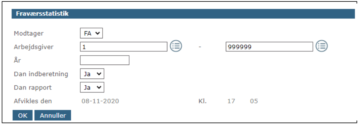 Fraværsstatistik kan også indberettes manuelt. Det gøres under menupunktet Lønadministration, Overførsel og Fraværsstatistik. Husk at angive korrekt modtager.