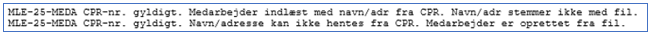 Hvis vi ikke kan hente navn og adresse fra CPR-registret vil medarbejderen blive oprettet med de oplysninger, der er i den decentrale fil, og man fil få en besked magen til linje 2 i billedet herunder.