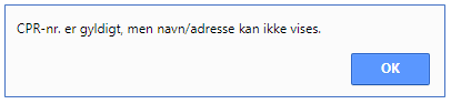 Hvis man indtaster et CPR-nummer på en medarbejder med beskyttet adresse eller på en afdød, vil man ikke få oplyst den præcise årsag til, at vi ikke kan hente navn og adresse. I stedet vil man få nedenstående besked, og man skal så taste navn og adresse manuelt.