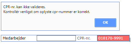 Hvis CPR-nummeret ikke kan valideres, vises der en pop-up med info om, at CPR-nr. ikke kan valideres, og det vil blive rødt. Eksempel på validering ved konstrueret CPR-nummer ses herunder. Samme besked vil ses, hvis man taster CPR-nummer på en medarbejder med adresse i udlandet.