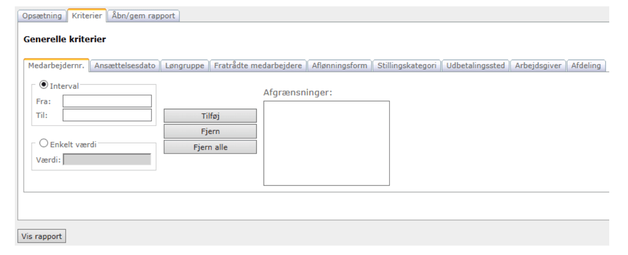 Du kan sætte kriterier op, så kun de medarbejdere, der opfylder kriterierne vil blive vist i rapporten. De Generelle kriterier kan anvendes på de felter, du har udvalgt under Stamoplysninger. Derudover er det også muligt at sætte kriterier op, som knytter sig til det spor, du har valgt under ’Opsætning’. De vil være forskellige, alt efter hvilket spor du har valgt.